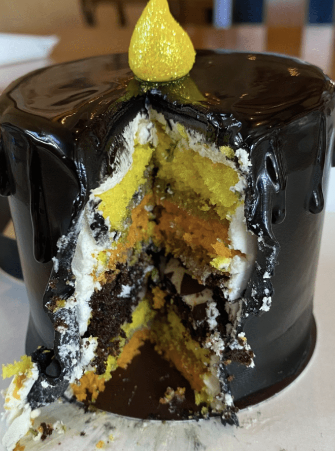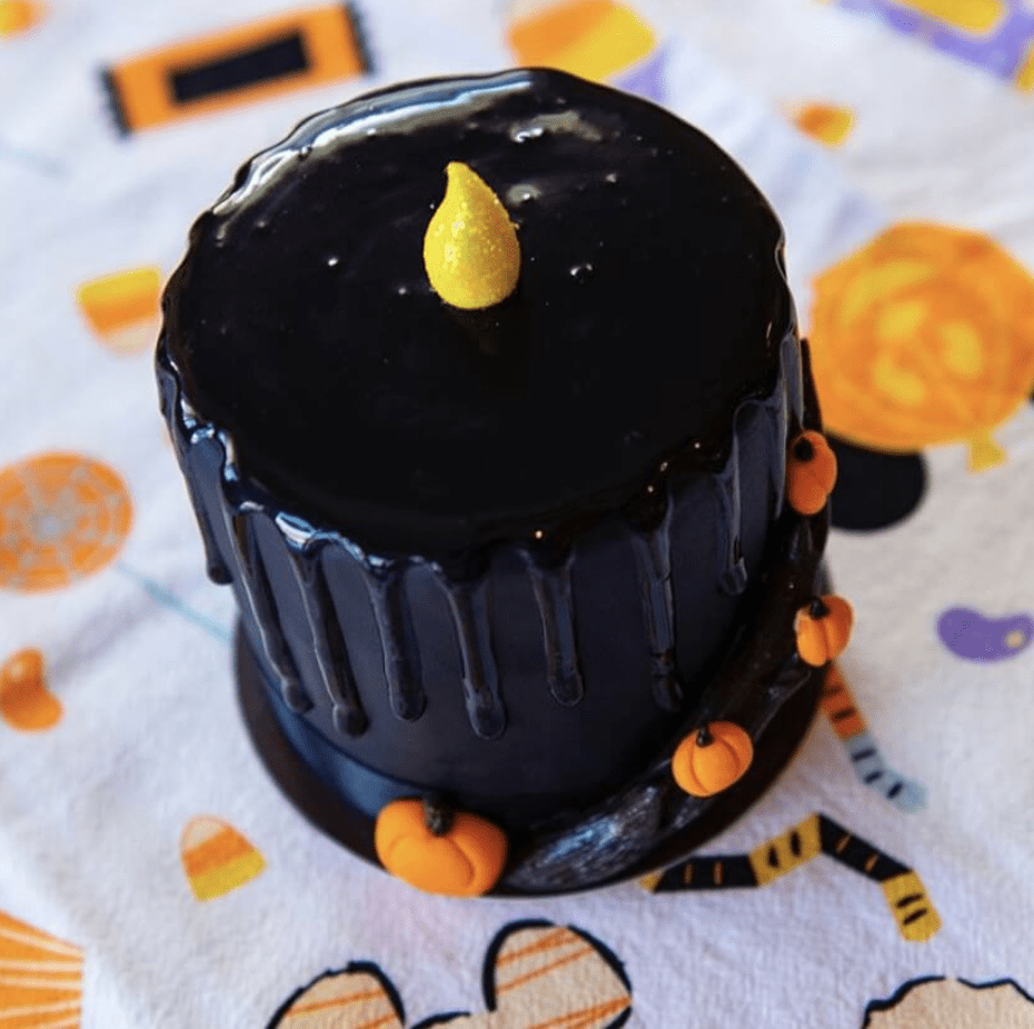 - Halloween Candle Petit: capas de bizcochito de chiffon amarillo y anaranjado, con una capa de cookies & cream mousse. Rodeado de glaseado negro y fondant de chocolate blanco. Hermosamente decorado de Halloween.